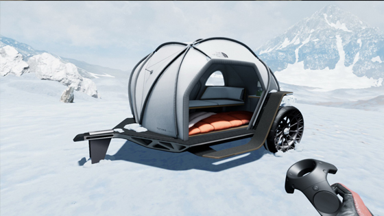وتم تصميم النموذج على شكل كروي، وهو مزود بمحور عجلات خلفي وجزء أمامي لتثبيته على الأرض، وهو أيضا الجزء الذي يتم ربطه بالسيارة، ويضم النموذج من الداخل مكان للجلوس يمكن استخدامه أيضا كمنضدة، وكذلك يمكن طيه عند الحاجة لتوفير مساحة داخلية أكبر، كما يوجد بأرضية النموذج مكان مخصص للنوم.