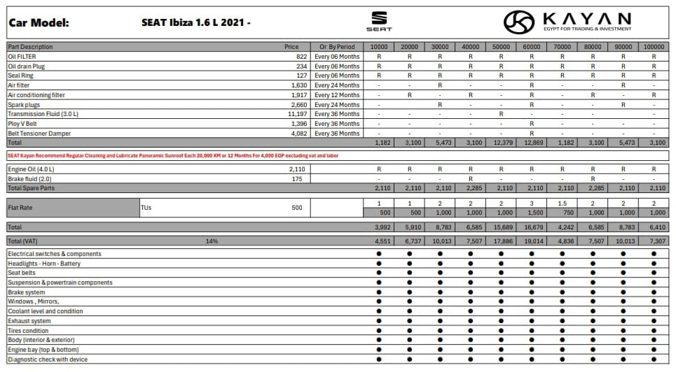 أعلنت شركة كيان ايجيبت (وكيل شركة سيات في مصر) مؤخرا عن أحدث قائمة سعرية لصيانة سياراتها في السوق المصري، ومن ضمنهم سيات إبيزا المتاحة في السوق المحلي، حيث كانت هذه القائمة كالتالي: